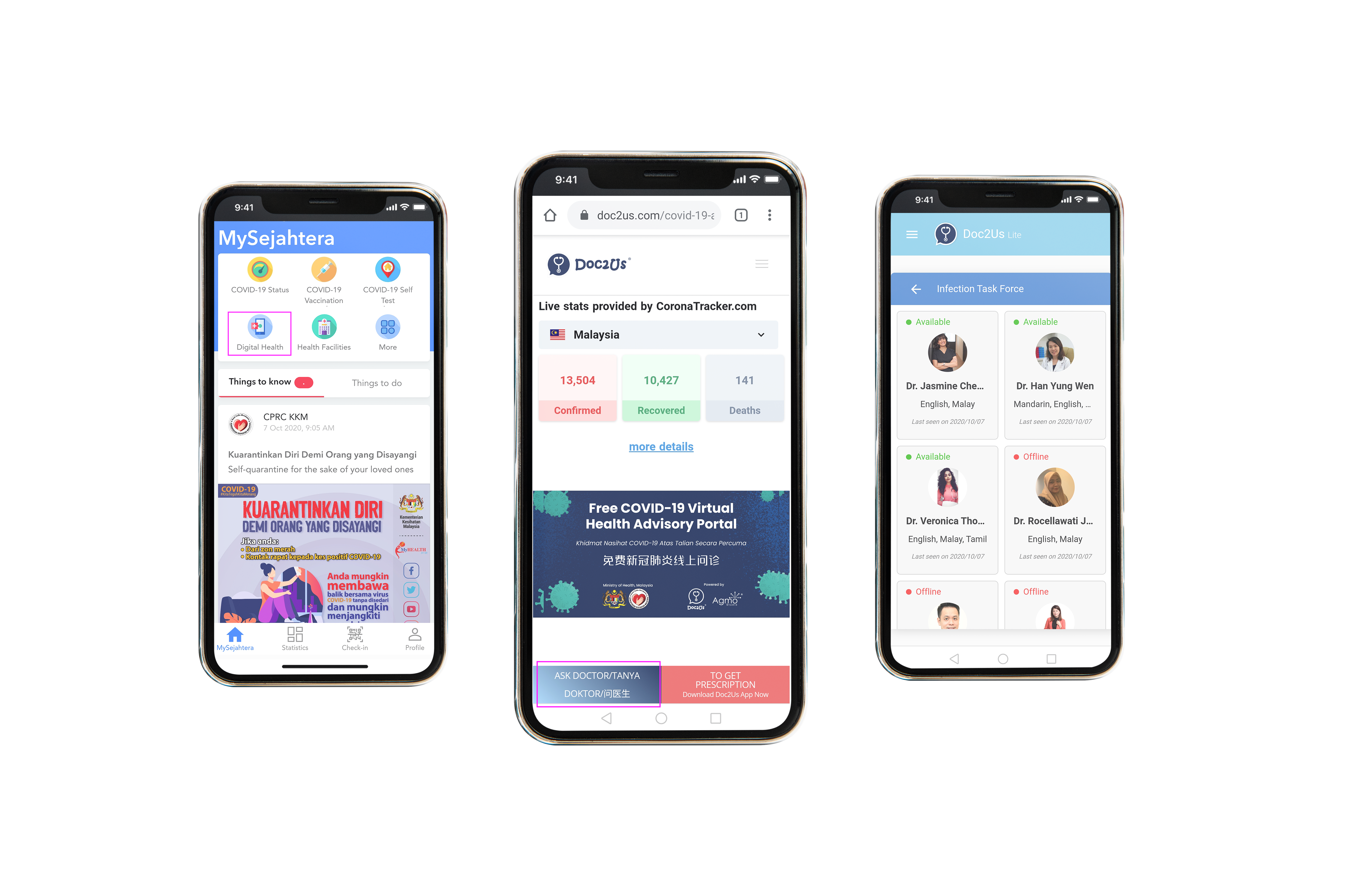 Digital Health: DOC2US is a voluntary virtual health advisory service with the aim to help the public gain adequate information about the spread and the management of the Covid-19 pandemic and reduce patient-medical health care specialist contact. The public can ask our task force questions on Covid-19 and related matters via the MySejahtera App for free